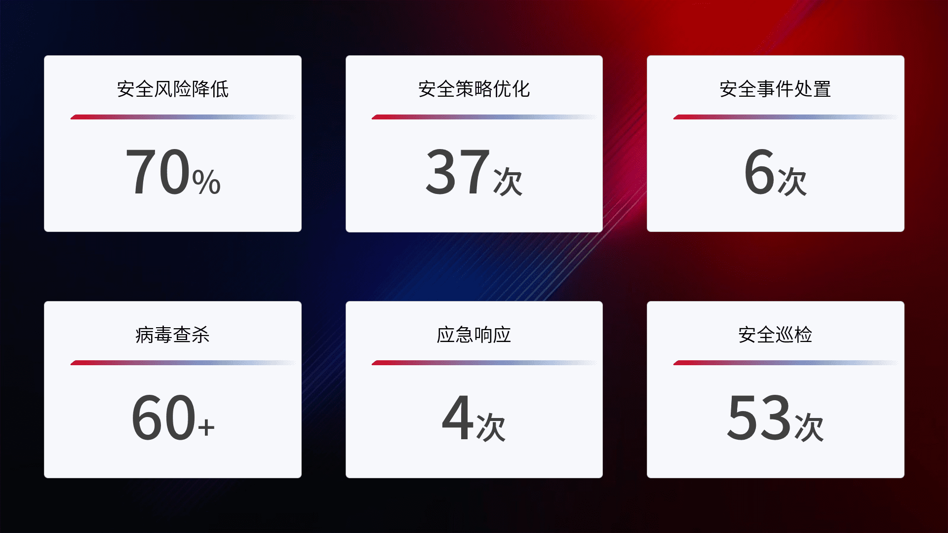 提供全面的安全事件报告体系,,,包括处置报告、、、、周报、、、、季度和年度总结,,结合持续监控,,,帮助客户深入了解网络安全状况。。。。